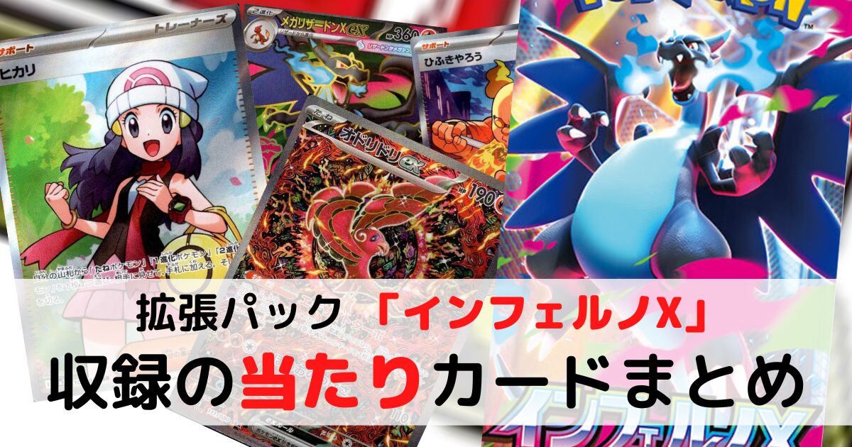 2025年9月26日(金)に発売された、ポケモンカードゲーム MEGAの、拡張パック「インフェルノX」に収録されているカードの、「販売価格相場(通販サイト調べ)」をレアリティ別で調べ、販売価格の高いカードを「当たりカード」としてまとめました。